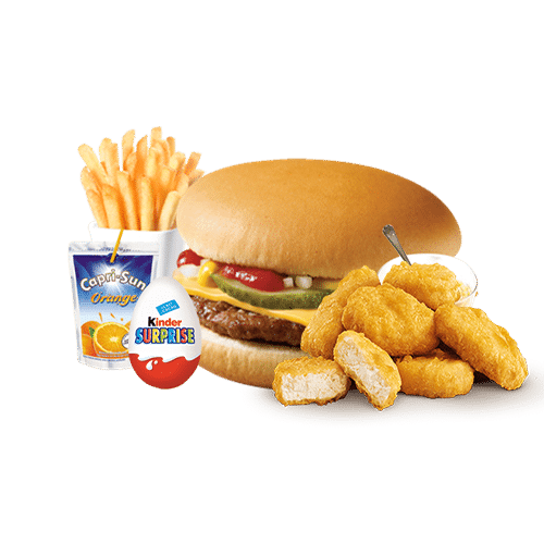 Cheese Burger ou 4 nuggets ou un hotdog + caprisun + frites + kinder surprise